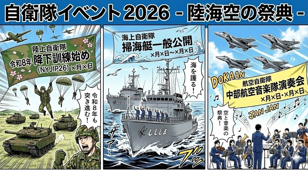 📅 2026年2月 自衛隊イベントリスト 2月1日(日) 当日参加可 自衛隊広報展示イベント2026 in アピタ新潟亀田店 📍場所:新潟県 新潟市(アピタ新潟亀田店) 📝内容:新潟地方協力本部による広報展示。車両展示や制服試着などが予想されます。 2月5日(木) 要応募 陸上自衛隊 富士駐屯地見学ツアー(戦車射撃見学等) 📍場所:静岡県 小山町(富士駐屯地) ⚠️主催:東京地本 豊島出張所(※詳細は地本HP等で要確認) 2月8日(日) 要応募 海上自衛隊 館山航空基地 見学ツアー 📍場所:千葉県 館山市 ...