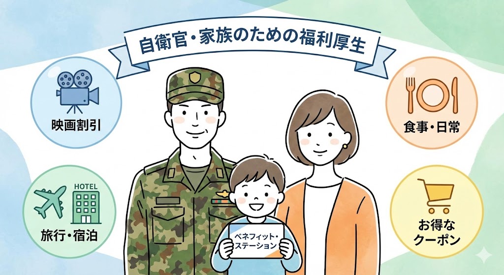 自衛官と家族のための「ベネフィット」活用完全ガイド 自衛官の皆さん、そして奥様・旦那様。 「ベネフィット・ステーション」という言葉を聞いたことはありますか? 実は、自衛官(防衛省共済組合員)は、毎月の給料から引かれている掛金によって、「日本最大級の割引サービス」に自動加入しているのです。 使わないのは、毎月お金をドブに捨てているのと同じです! このページでは、今日から使えるお得な権利について解説します。 1. そもそも「ベネフィット」ってなに? 簡単に言うと、「コンビニ、映画、旅行、食事、ジムなどが全部安 ...